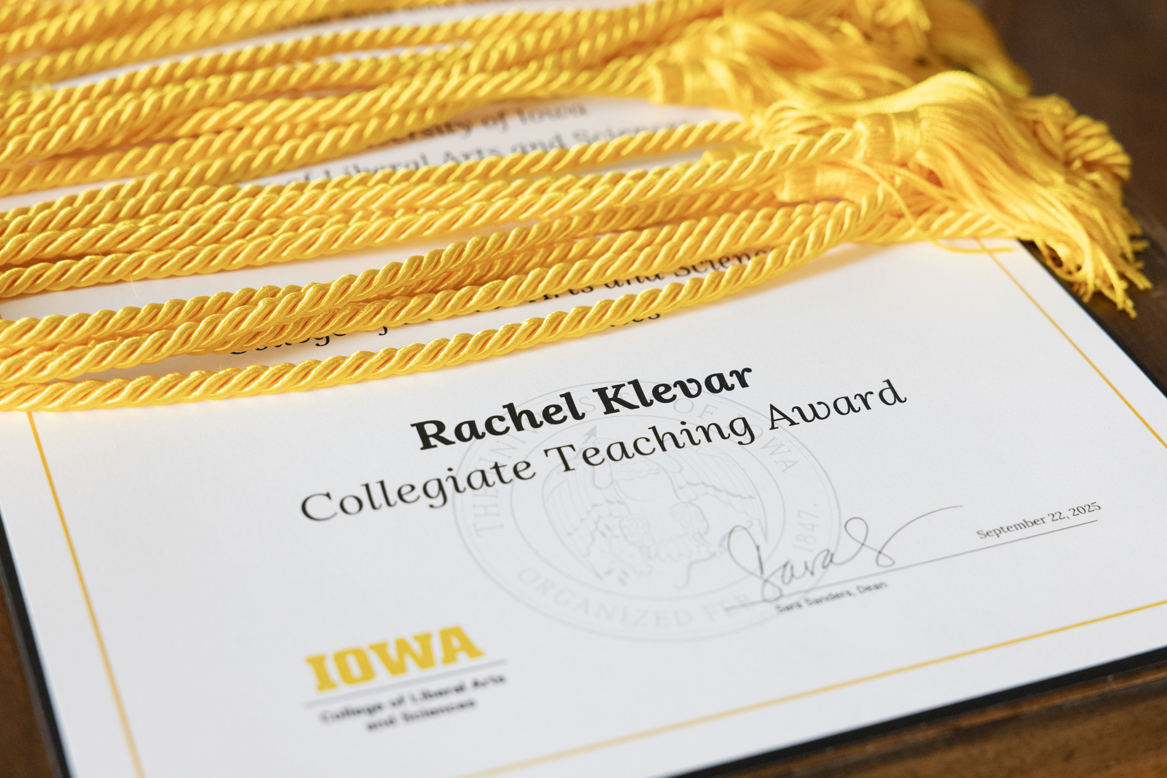 The International Engagement Teaching Award, jointly awarded by the College of Liberal Arts and Sciences and University of Iowa International Programs, is given annually to a CLAS faculty member in recognition of their excellence in fostering inclusive learning environments for international and domestic students; integrating international perspectives into the curriculum; or encouraging international experiences, such as internships, study abroad, and service work for students.